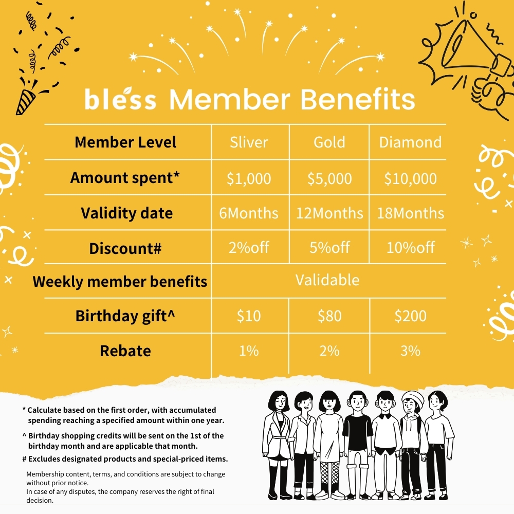 - For each order totaling over $300, members will receive a shopping credit rebate of 1-3% based on their membership level (until the membership validity period ends). This can be used as cash for the next purchase.